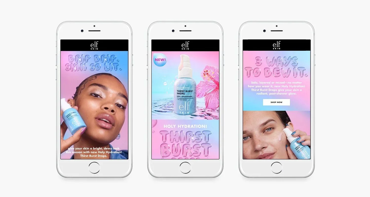 These Drops Dew the Most launched e.l.f. SKIN’s Thirst Burst through a bold, multi-channel creative system that balanced core product and model photography with hyper-real CGI elements. The campaign introduced a “dewasis” world—a stylized visual layer used to amplify product benefits—while maintaining the clarity and credibility of traditional beauty imagery across retail and brand channels.